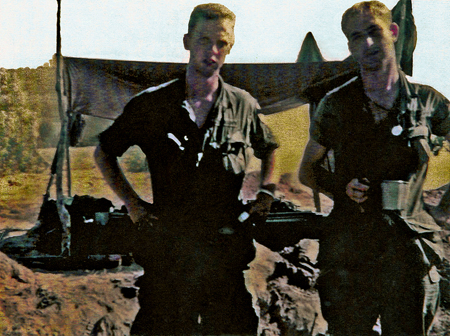 This is a picture of about half of the First Platoon. The LZ is English, where the photo was shot at an azimuth of 173°, just east of true south, at about 0809 hours, sun time (see Illustration). Due to a singular dust mark found on a half dozen photos and shared by this one, this picture can be dated sometime near July 2. The DSJs show that the First Platoon was at English for the first time on June 26, and didn't return until July 21, so the earlier date seems preferable. The Platoon was sent in from the field, but not for a rest, as was hoped, but for duties, in this case, probably starting with erecting the tent seen to the formation's left. Most of us were hoping instead to visit Bong Son. |