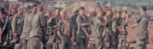 ① Unidentified, ② Unidentified, ③ Don “Truck” Schmidt, ④ Unidentified, ⑤ Probably Ed House, ⑥ Larry Nunn (?), ⑦ Jerry Prater, ⑧ Wayne Westenberger, ⑨ Larry Johnson, ⑩ Robert F. Cerny, ⑪ Unidentified, ⑫ Unidentified, ⑬ Doc Don Ferguson, ⑭ Occluded, ⑮ Joe Archuleta, ⑯ Cliff Veazie, ⑰ Phil Gibson, ⑱ Richard “Deacon” Dieterle, ⑲ Platoon Sergeant Robert L. Prock. |
